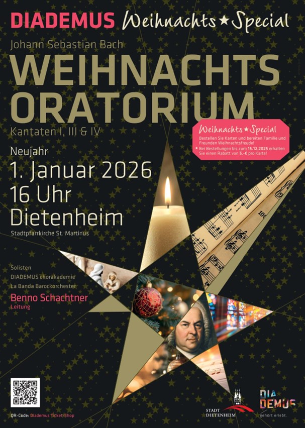 Am 01. Januar 2026 um 16 Uhr erwartet uns in der St. Martinus-Kirche Dietenheim ein besonderes musikalisches Highlight zum Jahresbeginn: Unter der Leitung des Dietenheimer Countertenors Benno Schachtner erklingt das Weihnachtsoratorium von Johann Sebastian Bach (BWV 248).